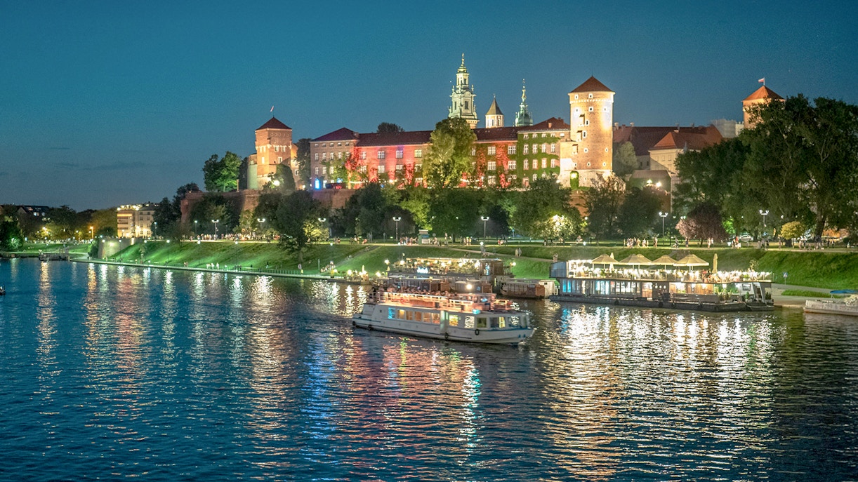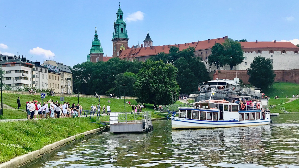 Erkunden Sie die malerische Stadt Krakau und ihre Wahrzeichen von der Weichsel aus, darunter Attraktionen wie das Schloss Wawel und die Felsenkirche. Einige Sightseeing-Bootsfahrten beinhalten auch einen mehrsprachigen Audioguide.